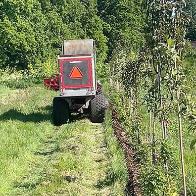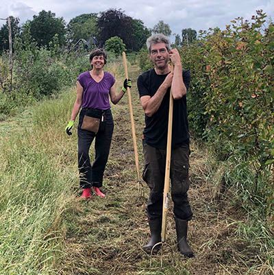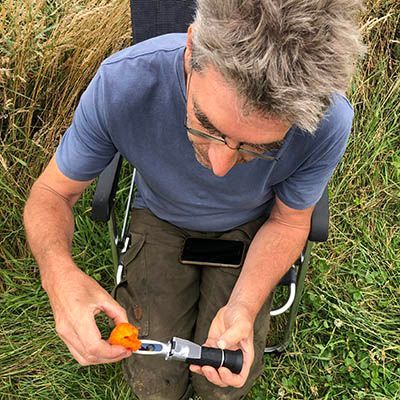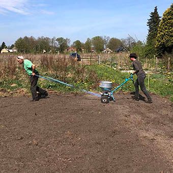Om de bodembiologie te stimuleren brouwen we compostthee. Dat is precies hoe het klinkt: Een zakje compost in een vat water. In deze ‘thee’ vermeerdert het bodemleven uit de compost zich heel snel, en dat leven voegen we via de gieter toe aan de bodem. Ook strooien we, voor een kick-start, biologische korrels bij de boompjes die het bodemleven stimuleren. Om een zo gevarieerd mogelijk bodemleven te krijgen zaaien we een uiteenlopend mengsel van kruidachtige planten en bloemen tussen de bomenrijen. Want elke plant trekt weer andere bacteriën, schimmels en andere microben aan, die samen voor een gezonde balans zorgen. Duizelt het al? Ons ook wel eens. Maar als het bodemleven eenmaal op gang is, gaat de rest vanzelf. Nou ja, behalve het oogsten dan..
