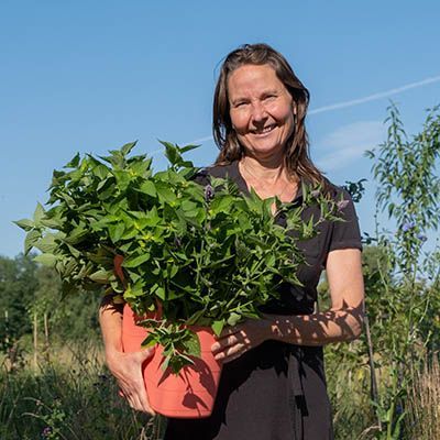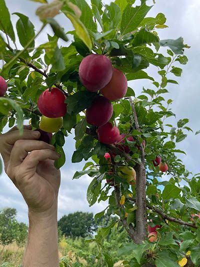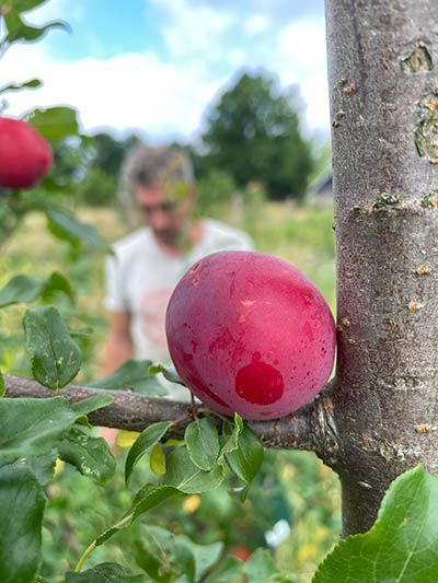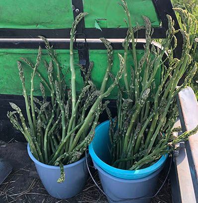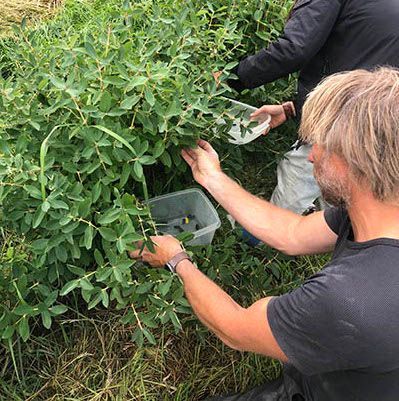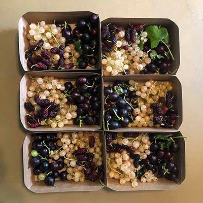 In mei openen we het oogstseizoen. De groene asperges zijn dit jaar voor het eerst oogstbaar: Vijftien kilo jonge scheuten snijden we eraf. Half mei volgen de honingbessen: ruim drie weken later dan vorig jaar. We worden overrompeld door de hoeveelheden: Op één ochtend plukken we met de vrijwilligers méér honingbessen dan in het hele voorgaande jaar! Half juni zijn ook de eerste krenten, rode en witte bessen en Taybessen rijp, en snel daarop de eerste pruimen, iets vroeger dan hun naam ‘Rose of July’ doet vermoeden. Verder zwarte bessen, jostabessen, kruisbessen en een paar moerbeien. Op 6 juli staat de teller op 240 kg fruit en beginnen we aan de abrikozen en perziken. Ook oogsten we vlierbloesem en andere eetbare bloemen, kruiden en bladgroen uit het bos.