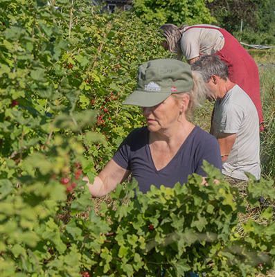 Nu de oogst aan de man brengen! Dit jaar stellen we de Bongerd een aantal dagen open voor de zelfpluk. De eerste dag dit jaar wordt afgelast omdat de bessen nog niet rijp zijn. De tweede dag regent het pijpenstelen. De derde dag, begin juli, wordt er flink geplukt: emmers vol worden er afgewogen, en bij de kar met koffie en limonade afgewogen.