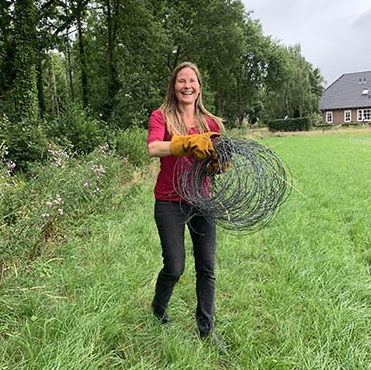 Aan het eind van de zomervakantie breidde het leven op het erf zich uit met drie brave Tinker-paarden… zomaar! Tinkers zijn ruw behaard en lekker stevig, meestal niet al te groot. Ze komen uit Ierland waar ze de kar trekken en ook wel in het bos worden ingezet om te sjouwen met boomstammen. Ze kunnen het hele jaar buiten in de wei staan, dag en nacht, zolang ze een schuilplek hebben. Daar lopen ze zelf in als ze de vliegen of het weer beu zijn. Een ras dat perfect past in onze plannen om door de percelen van het voedselbos een paddock-paradise aan te leggen: Een route voor paarden waar ze aangemoedigd worden te bewegen in een soort paardenvoedselbos: stapje – hapje – stapje – hapje. Daar stonden we ineens, nieuwe, hogere palen met schrikdraad te slaan voor dit fantastische gezelschap.