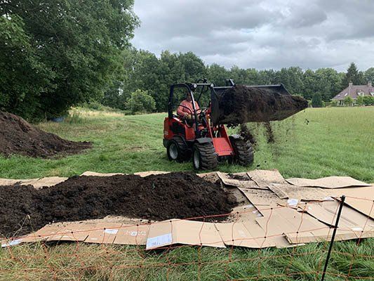 Op het land rondom het erf sloegen we aan het opruimen: Paaltjes, prikkeldraad, bramen en invasieve exoten. Er kwam een omheining op de kwekerij, om de hond binnen te houden en de reeën buiten. Ook is een begin gemaakt met het aanleggen van de moederbedden op de kwekerij. Daarvoor moeten we eerst het gras eronder krijgen, anders hebben de nieuwe planten te veel concurrentie. Al maanden verzamelden we grote stukken karton, om stroken gras mee af te dekken. Door lichtgebrek sterft het gras daaronder af, en levert voer voor het bodemleven. Bovenop het karton komt een laag compost. Die houdt vocht vast, en helpt het bodemleven verder op gang. Deels zaaien we de compost in met groenbemesters zoals klaver, koolzaad en diverse bloemen. Die leggen stikstof vast in de bodem, en zorgen ervoor dat ongewenste plantjes minder kans krijgen. Het plan om er een mulchlaag van houtsnippers overheen te leggen blijkt qua kosten niet haalbaar: De prijzen van houtsnippers zijn vier keer over de kop gegaan nu er vanuit de energiecentrales zo'n grote vraag is naar biomassa.