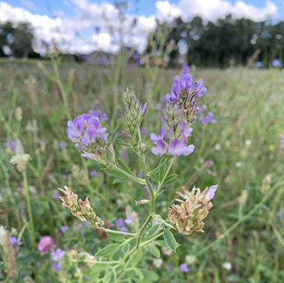 De stroken waar een paar jaar geleden kruiden waren ingezaaid bleven nog het langst fris. De cichorei, klaver en klein streepzaad kwam hier voor het eerst in volle bloei, nu de maaimachine niet meer langskomt. Een feest voor de vlinders en andere insecten! Toch kregen ook deze planten het flink te verduren: de waas van meeldauw op hun blaadjes is een duidelijk teken van waterstress. Maar zo kapot als het gras ging het niet.