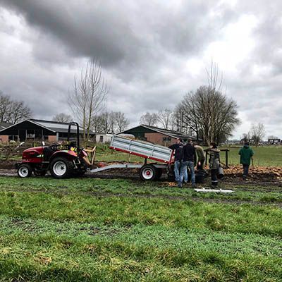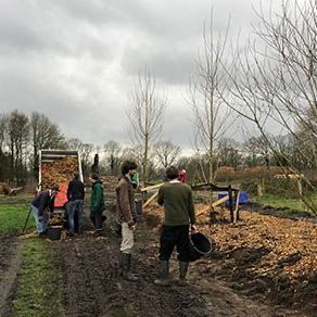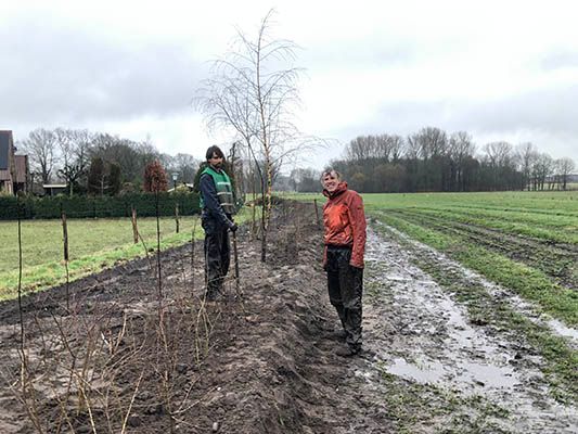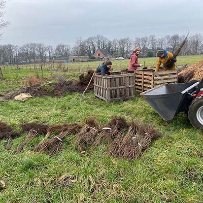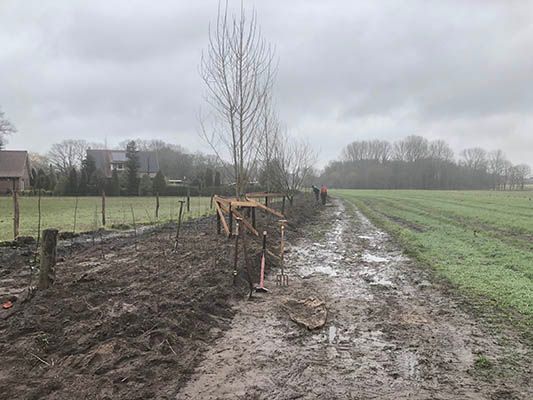 Het was, zo laat in het seizoen, wel even speuren naar inheems plantgoed. Lex van Heg en Landschap was daarbij onmisbaar. Dat waren ook de vrijwilligers : Tijdens een plantweekend half februari stonden zij, ondanks de regen, stoer in het veld om de 3500 boompjes de grond in te krijgen. Hoopheggen hielp met financiering en het vinden van helpende handen voor de aanplant.