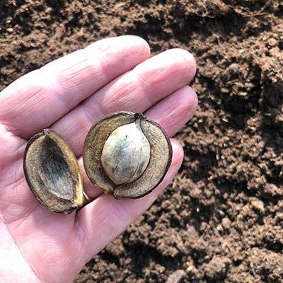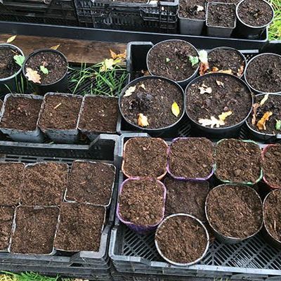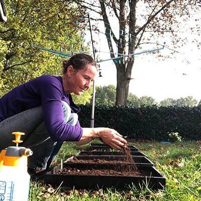 Omdat we dit eerste jaar geen plantmateriaal hebben om mee te stekken en enten, beginnen we met zaaien. Zaden voor het voedselbos zijn niet breed verkrijgbaar. Dus gaan we langs bij kwekers, arboreta en privécollecties waar de felbegeerde bomen en struiken te vinden zijn. Soms liggen de zaden gewoon op straat. Zo vinden we de valse Christusdoorn (Gleditsia triacanthos) in hartje Amsterdam. En ken je de slangenden (Araucaria araucana), die in de jaren zeventig massaal is aangeplant in veel te kleine voortuintjes? Aan de vrouwelijke bomen komen enorme kegels, met daarin kilo’s van wat lijkt op reuzepijnboompitten. Voedzaam en lekker. Als je goed kijkt liggen ze voor het oprapen.