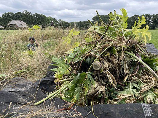 De reuzenberenklauw groeit graag op verstoorde gronden en slootkanten. Ook bij ons staat hij in groten getale langs de watergangen, waar hij andere begroeiing verdringt. Nog een reden om er vanaf te willen is dat deze plant brandwonden kan veroorzaken bij aanraking. De zaden blijven tot zeven jaar kiemkrachtig. We proberen 'm weg te krijgen door drie of vier keer per jaar te maaien en de bloemen weg te halen. Maud is daar alvast mee begonnen. De reuzenbereklauw kan niet tegen schaduw, dus als het bos eenmaal staat blijft hij hopelijk weg.