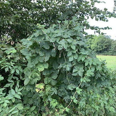 Nog een plant waar we de handen vol aan hebben is de braam (Rubus fruticosus). Overal waar de slingerende takken de grond raken wortelt deze inheemse woekeraar. Bramen maken het door hun scherpe stekels lastig om in het bos te werken, en overwoekeren andere planten in de onderbegroeiing. Er zijn in Nederland wel 190 braamsoorten geteld; veel daarvan doen het goed op stikstofrijke plekken en verzuurde bodems, zoals aan de rand van landbouwpercelen. Op ons land werd hij in toom gehouden door het maaien van de weilanden. Nu we daarmee zijn gestopt rukt de braam vanuit de randen op. We hebben al heel wat uren besteed aan het uittrekken om verdere verspreiding te voorkomen. De hop helpt hier en daar een handje: deze klimmer overwoekert soms de woekeraar.